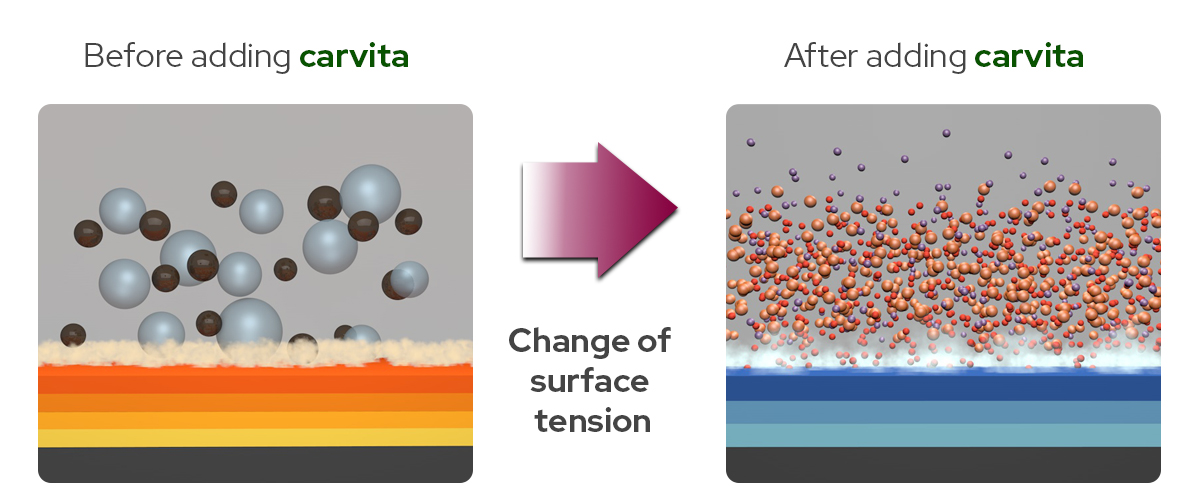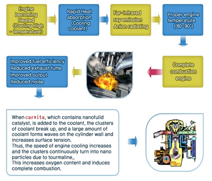 When the cluster of water particles is small, the area that contacts the engine increases, thus the speed of heat absorption increases, and the cooling efficiency of the engine improves. The action mechanism of Car-Vita is based on its role as a catalyst that induces complete combustion and optimizes engine cooling by activating ions in the coolant in the automobile and turning it into nanofluid.